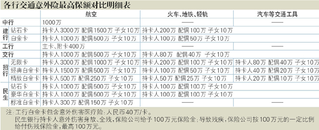 建行卡分别从航空、火车、地铁、轻轨、轮船、汽车等交通工具度身定制了不同交通工具意外险,惠泽亲属。保险的最高额度也是在行业同类卡种中位居第一。从不同的角度、从受益人范围都进行了最完善的保障。