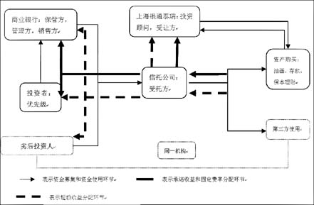 其次,承诺收益和固定费率分配环节,期末投资产品全部售出或由受让方受让,则依次支付受托人0.8%的信托费,产品保管人、管理人、销售人(商业银行)1.7%的“三费”(保管费、管理费、销售费)之和,顾问方1%的投资顾问费,使用方1.5%的投资运营费用,优先级投资者本金和6%的承诺收益,次级投资者本金和6%的承诺收益。