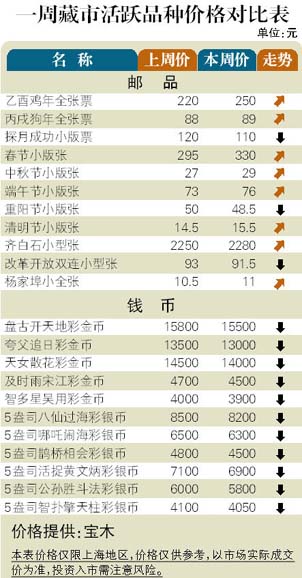 春节前的藏市表现平淡,随着坐商和投资者相继离市回家,成交一落千丈,即使“壬辰龙”版张的热点也捉襟见肘,许多人对价格涨跌充耳不闻。邮市:“壬辰龙”版张的炒作明显降温,主要是大量短线客不敢抱筹过年,落袋为安情绪占据主流。因此,“壬辰龙”全张票和小版张分别下滑到250元和52.5元就不会让人感到奇怪。但因整体价格仍高高在上,不排除春季后继续炒作。此外,2011年度会员票确定,为“无锡亚展”双连小型张,由此双连张板块在春节前出现上扬。币市:成交极度萎缩,尤其是随着近期国际金价下滑,令金银币交易雪上添霜,偶有购买“壬辰龙”金银币者,但因买卖双方难以谈拢,夭折的生意不少。