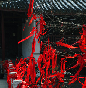2012年初一早上,南京栖霞寺。“爸爸!爸爸!”小女儿指着那些飘动红色物体说“哪些东西是什么呢?”我牵着女儿好奇地走过去询问寺院里的工作人员。原来,那些红色的物体是用纸和布做成的吉祥卡及吉祥带。每年初一,许多人携全家老小都要在这里请上一张吉祥卡或者一条吉祥带,把祝福的话语和自己的姓名写在上面,然后用一支长长的竹杆把它高高挂到庭中古树上。这象征着鸿运当头,高高在上。