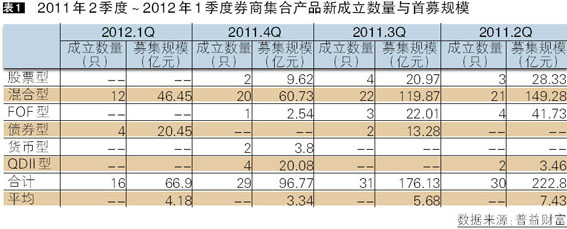 一方面因春节长假前夕资金较为紧张,各大银行加速回笼资金,无暇销售;另一方面因投资者对股市信心不足,购买券商集合理财产品的意愿较低,券商从2011年12月便开始推迟已经通过审批的产品发行,2011年12月和2012年1月分别仅有3家证券公司推广新的券商集合理财产品。然而,春节过后,券商发行新产品的力度出现反转,延续了前两年的迅猛增长势头,因而3月份券商集合理财产品的成立数量出现大幅攀升。总体来看,因春节的因素,1季度成立的券商集合理财产品出现大幅回落,共有16只券商集合理财产品成立,较2011年4季度减少13只。