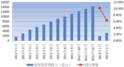 2012年1-2月,产险保费收入实现14.89%的同比涨幅,增长幅度较2011年同期回落。产险保费收入中,车险占据七成左右,因此车辆的销售量和保有量对产险行业的影响较大。2012年,新车销售量增速持续下滑,预计2012年汽车销售增速仅有6%左右,而汽车保有量增速则为15%左右。汽车销售量和保有量对产险将会造成负面影响,但是随着汽车的更新换代,车均保价上升,产险的保费收入增速不会出现如汽车销量般的下滑。