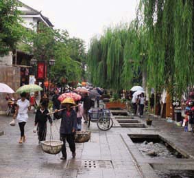 窄街上的行人渐渐多了。经过一个菜场,新鲜的蔬菜或堆放在地上的旧布单上,或在木头小车上。去吃“凉鸡米线”,一家不大的小铺,看上去很有些年头了,铺里整齐摆放着四方小桌和长凳,旧是旧了,却是整洁。粗碗盛着莹白的米线,撒些碎花生米和鸡丝,味道极好。咿呀咿呀的胡琴声隐约传来,悠闲的底子便露了出来。
