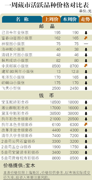 藏市甫入6月初,“歇夏”的低迷之态已十分明显,下跌品种明显增多,成交量极度低迷,不少坐商全天不见一笔交易。邮市:“清明上河图”、“洛神赋图”和“神骏图”小版票分别下挫至46元、38元和75元,双连小型张中的“改革开放”、“洛阳世展”、“世博会”和“无锡亚展”分别回调到41.5元、68.5元、35元和32元附近,而“共青团90年”小版张则下沉至8元面值成交,后市打折仅时间问题。币市:“五台山”2盎司银币高开低走,本周初价格已回调至1750元附近,买气不佳。5盎司规格彩金币买卖价格差距继续拉大,个别品种的网上报价与实际成交价差距达30%,显示承接盘的极度羸弱。