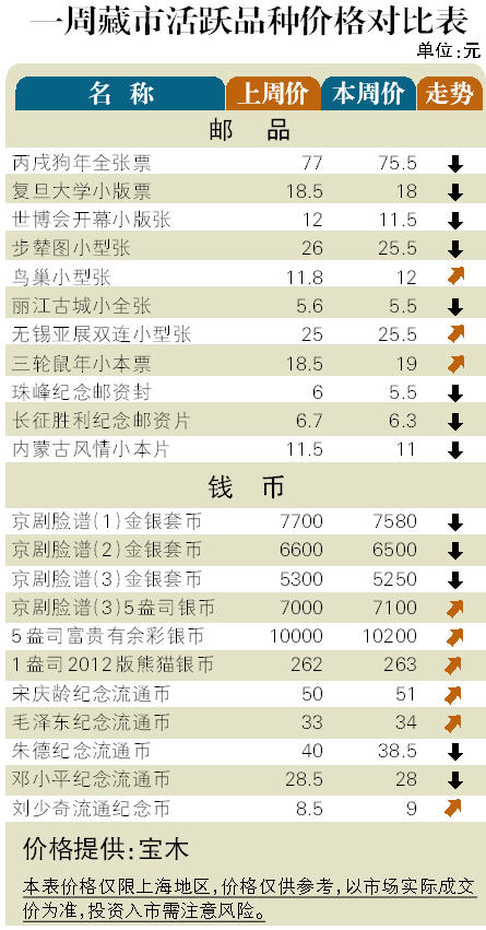 双节”长假市场明显遇冷,大多数邮商因藏市闭门谢客而无奈外出休闲度假,这也令交易出现短暂停顿。好在104日起,上海的“卢工”邮市率先开门迎客,到上周末藏市已基本恢复往日交易氛围。邮市:市场热点匮乏,绝大多数热点品种盘桓,涨跌参差。“儒林外史”小版张跌至18元,“唐诗三百首”套票小版张则小升到21.5元。第一轮生肖中的“己巳蛇”邮票遭遇吸纳,产品票色彩浓郁,价格已走高到4元附近。币市:金银币受到国际金银价格变化影响颇为显著,整体呈振荡回调之势。2012版“熊猫”1盎司金币微挫至11700元,而新品中的“五台山”2盎司银币货源增多,价格回调至1950元,“青铜器”金银币回落到4900元,5盎司银币则下滑至6700元左右。