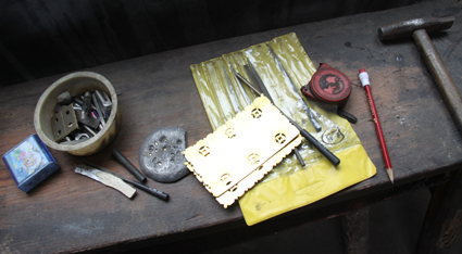 应广火做秤的小作坊就在自家的楼上,一张竹椅被磨得亮亮的,南方的气候溽热,做秤常常要坐上几个小时,椅子是竹条编的,很宽的缝隙,为了便于通风。应广火戴上老花镜,用缝衣针做成的手工钻在打磨好的秤杆上刻秤花。做秤的名堂很多,有十三四道:刨杆、下料、打眼,校秤、量步、锥星。民间有个说法叫“五匠合成一个秤师傅”,说的就是做秤是一门需要会“全活”的手艺。磨秤杆是木匠活,做秤钩和钮兜是铁匠和铜匠活。制秤毫是麻匠的手艺,最关键的刻秤花,也就是锥星则需要金匠的精准。而这“五匠”在应广火漫长的制秤生涯里,已经锤炼到炉火纯青的境界了。做秤的心思都在秤星上,应广火先把画好的秤花印在秤杆上,然后拿着铅笔样的小钻,根据花样的走势,钻出一个个间距细密的小洞,连缀起来就有了“荷仙姑”的模样,接下来就是金丝镶嵌了,这是最考验手艺的环节,材料贵是一方面,最紧要的是把细细的金丝准确地插进小孔,再用刀片平滑着切断它,留下一个个的星点,然后用小锤轻轻敲实,这个动作要重复几百次。而要在光滑的弧状杆面上完成如此精致的手工活,没有三五十年的功力是根本做不到的。秤花本是称斤两用的,但在应广火做的秤上却有了更多的妆饰意义,应广火设计的秤花有几十种,水浒、八仙、三国、十二生肖等,都是他多年积攒起来的。一枚秤花做好了,应广火摘下老花镜,用手摩挲着秤花,金丝在深褚色的秤面上闪烁着,星点的光晕有着妥帖的精巧,应广火的神情里有点满足。为了拍摄刻秤花的细节,同行的摄影师要求应广火再做个镶嵌金丝的动作,应广火又拿起了桌子上的钻头,一旁站着的儿子大概怕他累了,就小声提醒他,不用真的做,摆个姿势就好了。没想到,他突然发起火来,冲着儿子大声地嚷了起来,应广火生气了,他认为儿子在说他老了,做不动了。这让儿子有些委屈,站着不再说话。