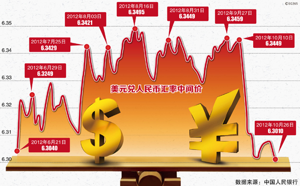 2012年10月25日,人民币兑美元即期汇率延续了近期单边上涨的行情,以涨停价收于6.2417,刷新了自2005年汇改以来的新高。专家表示,人民币对美元汇率走强的态势在年内仍将延续。图/CFP