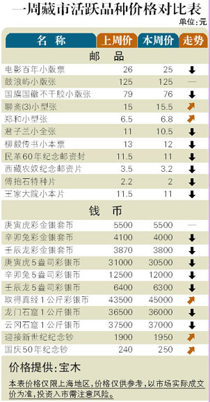 受2012邮币博览会举办影响,市场人气明显减弱,成交也进一步萎缩。由于市场对博览会发行的短腿品种兴趣不大,加之价格也高高在上,因此对市场冲击力度有限。邮市:主流热点聚焦产品票,成为近年市场趋弱之际最能显山露水的强势板块。其中T31“公路拱桥”、T77“明清扇面画”和T155“衡山”套票分别为47元、85元和5元,J22“毛主席纪念堂”、J87“郭沫若”和J162“孔子”套票分别在75元、17元和5.5元。币市:市场走势平淡,“青铜器”和“五台山”银币微挫至660元和1850元,而投资者则将目光放在即将亮相的“癸巳蛇”上。目前“癸巳蛇”本色金银套币和彩色金银套币的期货价分别为2800元和3300元。
