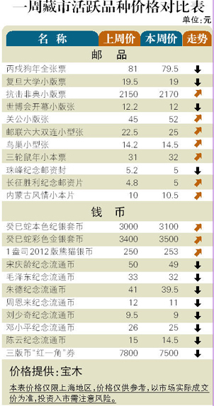 12月初,藏市反弹趋势没有改变,且涨升品种有增无减。金银币板块则继续围绕“癸巳蛇”金银币展开弱势反弹,但因金价上扬势头未能延续,令币市处于尴尬境地。邮市:“十八大”套票、小型张和小版张抛压出现,本周初分别下调至11元、9元和50元附近。而双连小型张表现出挑,其中“改革开放”、“洛阳世展”和“无锡亚展”分别攀升到45元、74元和35元。此外,丝绸小版张中的“朱仙镇年画”和“漳州年画”分别走高到18元和25元。币市:“癸巳蛇”金银币短线交易火爆,价格继续小幅上扬,其中“癸巳蛇”5盎司彩金币和彩银币价格为91000元和4800元。另外,“青铜器”和“五台山”金银套币分别维持在4250元和4750元,但成交略有放大。