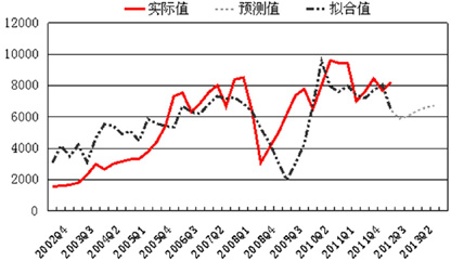 以需求加权的GDP作为经济指标,量化分析经济增长对铜价走势的影响。其中GDP数据按中国、美国及欧元区三地精铜消费比重加权,经2002年12月至今数据检验,加权后GDP与LME3月期铜价格的相关性高达68.34%,拟合值与实际值较为一致(见图3)。沿用最近上述三地区精铜消费比重,及彭博经济数据调查中的GDP预测数据,可以发现2013年全球经济形势依旧不容乐观,这将导致铜价仍存下行风险,但随多国经济触底回升,下半年铜价有反弹空间。(图3)