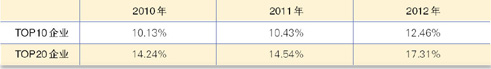 根据中国房地产测评中心联合上海克而瑞信息技术有限公司发布的《2012年度中国房企住宅销售排行榜TOP50》,2012年中国房地产市场集中度再度提升。2012年全国TOP10企业市场份额达到12.46%,较2011年上升了2.03个百分点;TOP20企业相较去年,有2.77个百分点的上升。强者恒强,集中度快速提升,入围门槛提高,是房地产政策调控以来最鲜明的企业特点。(表6)