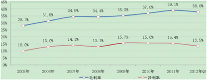 图2 2005-2012年三季度139家上市房企毛利率与净利率