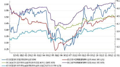 尽管回购利率在11月初开始逐步回落,但由于投资者心态谨慎,收益率变动不大。随着海外避险情绪因美国财政悬崖问题而有所增强,尤其是外资行对利率债的购买力度上升推动收益率小幅下行。10年期国债收益率从高位3.58%水平逐步回落到3.50%附近,10年期国开债收益率降至4.38%。进入下旬后,国内11月份汇丰PMI预览值显示经济增长动力继续恢复,推动国内债券收益率有所回升,10年期国债到3.53%,5年期非国开政策性银行债收益率回升到4.03%,10年国开债升至4.45%,收益率曲线相比于10月末有所变陡。