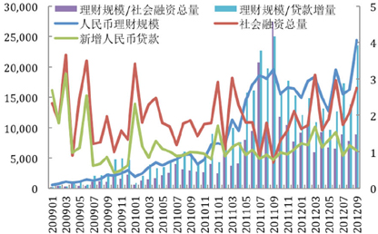 图4 人民币理财规模与人民新增贷款规模、社会融资总量对比分析