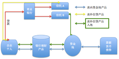 无论是发售数量,还是募集资金规模,亦或是市场关注度,资金池类产品无疑是银行理财产品市场中的一枚“奇葩”。其运作流程参见图1,分两步走:第一步,商业银行以表内资产——货币市场、债券市场和票据资产——组建正规的资金类产品;第二步,根据企业/个人客户资金需求,成立信贷资产类产品,可以分两层,第一层是信托公司主导的信托产品,第二层是商业银行与信托公司联合发售信托产品,此时商业银行再将该信托产品融入第一步建立的正规资金池产品,以实现表内资产的出表功能。特别地,表外信贷产品入池的典型手法有二:一则联合贷款产品,即短期流动资金贷款,企业和商业银行签订贷款合同,但资金来源是信托资金,然后银行和信托再签一个合同,标明“到期后贷款可以由银行承接”;二则“假股真债”产品,如恒鑫1号、恒大华府和恒大丹阳等。