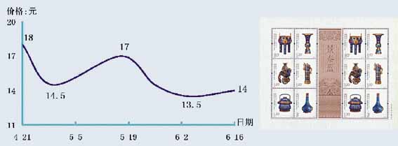 作为本轮行情的基石──产品票的走势被越来越多的投资者所关注,毕竟无论市场处于激越澎湃的上涨期,还是市场步入萎靡不振的调整期,产品票一直是邮市中的中流砥柱。但让人担忧的是,从今年3月初开始,产品票的热点与前两年相比出现降温迹象,其表现在热点品种的匮乏、收购价格的下降与需求量的减少上。或许这与礼品需求受到抑制有关,但从根本上讲却是买气的渐弱所致。如一些JT早期强势品种作为产品票,其本身就带有自身上扬的色彩,产品票的需求量并不大,更直接的却是投资买盘的介入,一旦这种买盘消失,其价格回调也就必然显现。对比一些品种今年初与6月中旬的收购价格,很明显可以发现收购买盘价格在下滑。像“奔马”小型张的买盘价格年初尚在3700─3900元,而6月中旬则降至3400元,套票中的“齐白石”、“西游记”和“京剧脸谱”等也是如此。