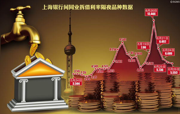 上海银行间同业拆放利率(简称Shibor),从2007年1月4日开始正式运行,标志着中国货币市场基准利率培育工作全面启动。Shibor的建设有利于进一步促进金融机构提高自主定价能力,指导货币市场定价,完善货币政策的传导机制,推进利率市场化。2013年6月20日,隔夜Shibor利率创下了历史最高点13.444%。图/CFP