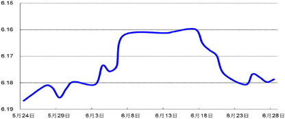 上周,人民币兑美元中间价呈横盘整理走势,当周变化不大,于上周五报6.1787元,较6月21日微跌0.03%;欧元兑美元下跌0.87%,报1.3008美元。