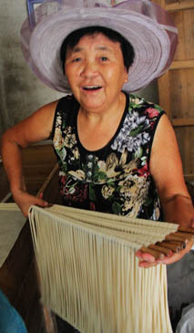 南山村是温州瑞安平阳坑一个小村落,如果不是纱面,很少会有人去关注它。这是一个民风朴实的地方,你借用方便、想上楼观景,当地人会很爽快地答应,而且还会对自己家居的粗陋而表示出歉意。而纱面,就是在这些朴实的乡人们手中,从面粉和成面团,从面团变成面条,从粗短转化为细长,变换着万种风情。晾纱面是南山的一景,阳光充足的日子,如纱幔般的纱面,满眼都是,真是妩媚。
