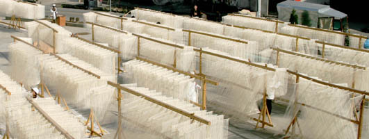 每年梅雨季节过后,浦江潘周家村的晒面场上,一挂挂细如鞋索的面阵,远远望去,就如同一匹匹漂晒的白布,颇为壮观。