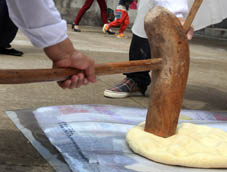 壮汉们用木制的榔头砸面团,增加面胚的韧性。