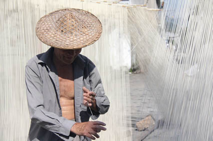 在林阿婆的纱面作坊里,制作面条的各种器具凌乱堆放着,很难想象,那样缥渺的纱面,是在这样的地方制作成形。每户小作坊基本上都敞开着家门,一大家子在里面忙活着。一边手中灵巧活络地盘面,一边应答你的疑惑。来客不拒,任由参观,而且提问知无不言。“来买的人很多的,意大利的都有。”林阿婆对门家正在盘面的老人自豪地说。南山村木、林、周三姓居多,正在盘面的老人姓木。他告诉我,纱面村做纱面谋生的人家并不占多数。纱面村有300多户人家,会做纱面的大约有五六十户。他说自己2分钟可盘55环面,他每天能盘300个左右55环的纱面架。