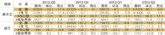 2013年1-6月份,房屋新开工面积95901万平方米,同比增长3.8%;其中,住宅新开工面积70630万平方米,增长2.9%。房屋竣工面积35346万平方米,同比增长6.3%;其中,住宅竣工面积27428万平方米,增长2.7%。无论是新开工还是竣工,上半年同比增速都较前5个月的增速有所加快。