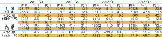 2013年1-6月份,商品房销售面积51433万平方米,同比增长28.7%, 增速比1-5月份回落6.9个百分点;其中,住宅销售面积增长30.4%。商品房销售额33376亿元,同比增长43.2%,增速比1-5月份回落9.6个百分点;其中,住宅销售额增长46.0%。