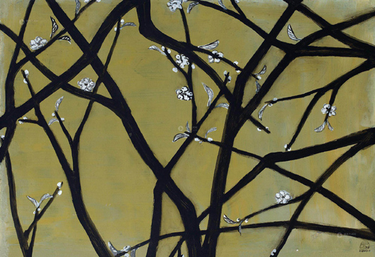 常玉(1901-1966)是一位难得的现代主义者,他将中国美学的含蓄内敛与西方美学的夸张外放成功糅合在一起,堪称近现代绘画艺术上超现实主义的典范。其孤寂绝美的独特风格,二十世纪中国画家中鲜少有人能与其媲美。花卉题材在常玉一生创作中占有最大的比重。《绿底白梅》创作于1950-60年代,作品中绿色底的运用、枝叶的穿插、留白观念,无一不是反映出他的母国文化背景。他将中国水墨画中常用的线条与空白,套入西方的空间结构,既有中国盆景的优雅古朴,又有西式瓶花的谨严奔放,两者自然结合,浑然天成。美学家蒋勋认为,由于常玉对生命本身的认真,使得他的绘画具有一种纯粹性。他的花卉最能展现生命中华丽与孤独的极致,从中我们可以看到他焠炼出的独特的文化美学,以及所呈现出的动人品质。