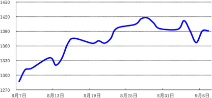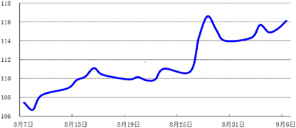 上周,中国及欧美经济数据持续好转,加之叙利亚局势有所缓和,致黄金避险价值减弱,国际金价下降4.81美元/盎司至1390.88美元/盎司;此外,布伦特原油价格较前周周五小幅上升2.11美元/桶至116.12美元/桶。