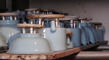在国家级陶瓷艺术大师朱文立先生的工作室,我终于见到了素净的天青色“汝瓷”、看见堆放着各种土料的窑场、也见到了穿着一件已经洗旧的西装神情宁静随和的朱文立先生,听他操着浓重的方言给我们介绍汝瓷,教我们用专业的放大镜观看汝瓷片上的“寥如星辰”,而房间里此起彼伏的,是我们一干人一边看一边“哇,好漂亮!”的惊叹声。