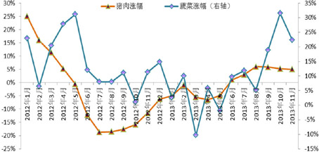 图3 2013年以来猪肉价格涨势温和,下半年蔬菜价格反季节上涨
