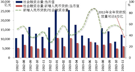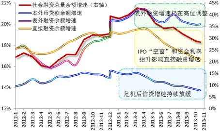 2013年前两个季度,在到期资金集中释放效应和非信贷类融资高速增长的拉动作用下,经济呈现出“金融热、实体冷”的独特局面,货币信贷和社会融资快速攀升。随后,监管机构加大对于包括影子银行在内的非信贷融资通道的监控,并规范各类金融市场的发展,加之6月份货币市场资金价格波动的警示、以及政策层调结构理念的逐渐入主,货币政策呈现中性偏紧情势,相应二、三季度以来,货币供给、社会融资均呈回落态势。