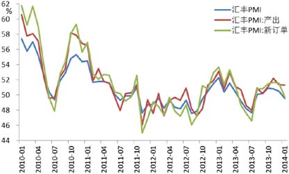 经济领先指标:2014年1月汇丰PMI预览值半年来首次跌破荣枯线,并已连续3个月下滑,虽然存在春节因素干扰,但主因是国内需求回落较快,领先指标的表现暗示一季度国内经济增速下滑的风险在扩大。(图1)