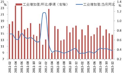 通胀:12月CPI同比先于预期回落至2.5%,领跌因素为果蔬和猪肉。需要注意的是,2013年下半年食品价格“反季节性”下跌的背后,是中央反腐和整治“四风”政策的影响在起作用,主要逻辑线条为“反腐——在外用膳食品、油脂、肉禽价格——食品价格;反腐——烟酒价格——非食品价格”。反腐政策的力度和持续性或构成影响后期CPI运行的不确定性因素。(图3、4)