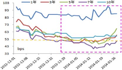 高等级信用债利差小幅震荡,中长端仍有拓宽需求。目前高评级信用债相对于利率债收益率优势仍不明显。截至1月27日,超AAA信用债利差多位于30bps的水平(仅1年期为73bps),;AAA信用债利差位于50-88bps的水平,虽然较前期的低位有所反弹,但与新资本管理办法要求的约60bps左右的风险资本相比,高出的并不多,部分银行对于产能过剩行业的AAA企业所要求的风险资本可能更高。考虑到国债的免税效应和风险资本占用,AAA企业债实际税后利率较国债要低2 bps和37bps,再加上信用债供给压力将有所增加。因此,中长期高等级信用债利差仍有拓宽的需要。