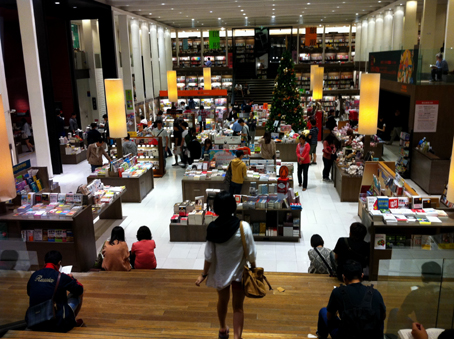 台湾各地都有诚品书店,因为在台北没有去诚品,到了高雄,就开始打听诚品的位置,高雄的诚品书店离我住的酒店不远,打车也就100台币。书店在远东百货的12楼,面积不算大,装修有些别致,两层的店是中空的,从一层很宽的木板楼梯上二层,还有便于搬运图书的坡道,二楼用围栏环在四周,通过围栏可以看到楼下的情况,两层楼间木板楼梯和坡道上坐着很多的读者正在阅读,除了顶上有白色的筒灯外,四周还有桔色的方柱型灯,显得很温馨。一层多是些畅销书和工具书,二层是专业书和文学书,一部分畅销书还标有7折、5折的字样,专业书和文学书是不打折的。绕了一圈,没有看到想找的文学书籍,就找到服务生问,是个女孩,还是先问“胡兰成”,回答说:“有,《山河岁月》,其他的没有”。再问,在哪个柜?女孩顺手一指:“文学类正中间那个柜,张爱玲的旁边。”我心中一颤,两人早已天各一方,各归东西,作品还被后人摆放在一起,多少有些伤感。大陆作者的作品也不少,莫言的最多,还有刘震云、韩寒、易中天、于丹等。
