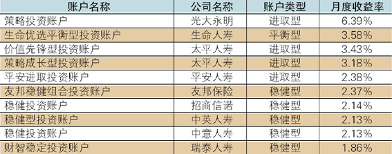 本月,所有投资账户中有106个获得正收益率,其中包括保守型31个、稳健型45个、平衡型15个、进取型15个。以上四类投资账户的月度平均收益率依次为0.52%、0.85%、-0.92%和-0.79%。月度收益表现最好的10个投资账户中,进取型4个,平衡型1个,稳健型5个,排名首位的是光大永明的策略投资账户。(表2)