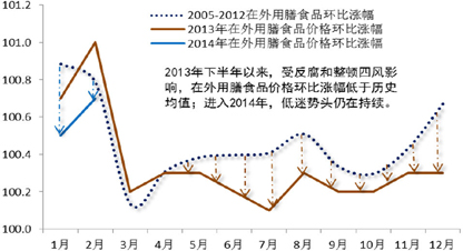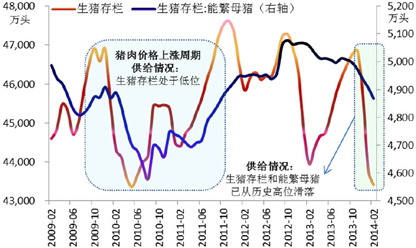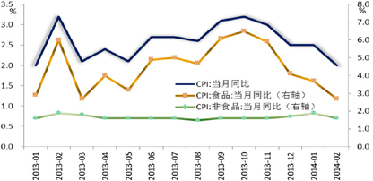 通胀:2月CPI涨幅的回落,除与春节错位有关外,还包括在外用膳食品需求不及往年,以及猪肉价格的走低等因素。目前,反腐政策力度仍在升级,1-2月在外用膳食品价格环比涨幅显著低于历史同期均值水平,延续了2013年下半年以来的颓势,在外用膳食品(占食品项目比重高达30%)的需求低迷暂未见尽头;而1-2月,生猪存栏数量骤降至上一轮猪肉价格上涨周期的水平,可能预示着猪价进一步下跌的压力在缓解。总体来看,当前仍未出现明显的涨价或异常因素,短期内通胀压力仍无忧。(图4、5、6)