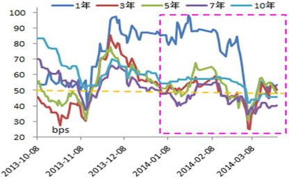 一季度利率债收益率曲线较上年末大幅陡峭化下行。2014年3月末,国债收益率曲线1年和3年期收益率下行幅度较大,分别为111bps和60bps;其次是5年和7年期,分别下行28bps和24bps;10年期仅下行4bps,幅度最小。(图9)