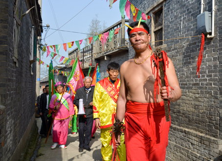 红裤红鞋,半裸着,嘴里念念有词,在菩萨前焚香祭拜后,“马皮”用一条烘烤过的长钎直穿脸颊而过,瞬间神灵附体,随后手持大刀铁棍,面目狰狞着带着从庙中抬出的菩萨,舞龙舞狮、腰鼓队、花船高跷以及“五马上将”车队等组成的队伍,穿街走巷驱赶邪魔,村中家家门前焚香相迎,燃鞭祈福。这就是江浙一带神秘而独特的庙会祭祀活动“马皮驱邪”,相传已流传近千年。