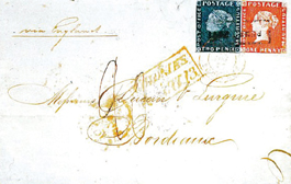 为什么“波尔多封”有如此盛名呢?这要从二十世纪初的西方集邮潮说起。1902年法国波尔多省,有个小学生因集邮之需,央求邻居一位退休酒商让他在过去的旧信里搜寻邮品。老人同意之后,这位少年集邮者幸运地找到两个贴有毛里求斯“邮局”珍邮的实寄封!其中一个被称为“波尔多封”的写着“至法国波尔多的杜坎和吕尔涅先生”,销整套邮票的邮戳非常之清晰。戳面的日期是1847年10月4日,离戈姆夫人的那次舞会还不到一周!该封背后有“毛里求斯邮局船运信件普利茅斯”的戳记,还盖有红色的伦敦圆形邮戳。当年为在“黑便士”邮票上留下明显销戳,英国邮戳改为红色。从戳记可知12月24日到达法国的布洛涅港,两天后到达巴黎,12月28日到达波尔多,寄递时间共八十五天!第二个信封只贴着一枚面值2便士的“邮局”珍邮,由于这个学生曾从集邮书刊上看到几年前艾尔伯特·霍华德在印度的收获,便不露声色地把这两个信封珍藏起来。两年后老酒商去世了,为弄清这件实寄封价值,在1904年1月17日他在父母陪同下来到巴黎,将此封拿给巴黎的一位很有名望的邮商托马斯·利梅尔鉴定,这位邮商很懂行,由于这种信封六年前在伦敦以8000美元成交,故邮商也同样以8000美元买下第一个信封。由于第二个信封是黑色邮戳盖在黑色邮票上,利梅尔便以日期不清为借口,只同意用6000美元买下。少年在父母怂恿下卖掉这两件稀世珍宝。1.4万美元当时可买七百两黄金,也够父子三人搬运!