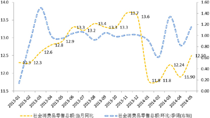 分项来看,目前,金银珠宝消费较4月有明显回升。民生相关消费,如粮油食品、衣服鞋帽、化妆品、日用品等消费增速相比于3、4月份继续小幅回升,显示居民的日常消费需求总体平稳,也是消费增速稳定的主要力量。与三公消费相关的限额以上餐饮企业的收入增速继续小幅回升态势,显示低基数效应逐步消除。石油制品消费在油价上调的情况下,增速也相应上升,最近国际油价大幅上涨,不排除油价继续上调,可能会使得该分项增速保持甚至继续上升。与房地产相关的家电、家具、建筑装潢材料的同比增速也有所回升,尽管房地产销量增速仍偏低,但置换与新增家电、家具需求仍相对稳定,略低于去年同期水平。