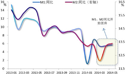 M2增速在2月份触及历史低点后,自3月份起连续三月回升,反映出央行此前中性偏紧的货币政策取向应已有所调整。其中5月M2增速的回升,主要是受益于信贷投放规模和财政支出增速高于预期两个因素。展望后期,考虑到:(1)未来一段时期内,货币政策维持偏松将是大概率事件;(2)信贷增速在政策引导下有望持续回升;(3)外汇占款增量或受益于出口情势改善而稳中有增;以及(4)稳增长政策下财政支出将会加快等因素,预计本年剩余月份M2增速或能保持在13%上方。
