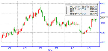 2014年上半年国际黄金现货市场开于1201.85美元/盎司,截至6月30日收于1327.33美元/盎司,涨幅10.44%,连续两个季度录得上涨。期间最高价1392.33美元/盎司,最低价1327.51美元/盎司,区间宽度64.82美元(图1)。国内黄金市场与国际金价走势趋同,上海金交所黄金(9999)上半年开于239.00元/克,收于261.86元/克,最高价273.60元/克,最低价236.36元/克,涨幅9.56%。(图1)