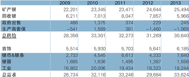 2013年全球矿产银产量增加3%至25,494吨,连续11年增长,不过增速较2012年的5%有所下降。主要生产国中,秘鲁、中国、澳大利亚、玻利维亚、智利等产量均有明显增加,墨西哥和波兰产量下降。从来源来看,原生银矿产量增加6%,金矿副产银产量增加3%,铅锌矿副产银产量持平,铜矿副产银产量增加7%,四者占总产量之比分别为29%、13%、38%和20%。银价下跌使企业更严格地控制成本,2013年,不含资本开支和勘探费用的平均总现金成本微涨1%至9.27美元/盎司。生产商套保活动大幅减少,已有头寸多被结清。