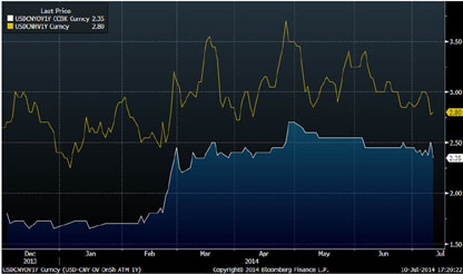 走势回顾:2014年上半年,境内人民币对外汇期权市场继续处于快速成长阶段,银行间市场日均成交量由年初仅5000万美元增加至当前约2亿美元,交易组合类型也有所丰富。受上半年即期汇率双向波动增大的影响,境内USDCNY隐含波动率大幅上升,一年期ATM隐含波动率由年初的1.7%最高上涨至2.7%,随着6月份日间即期汇率波动的减小,波动率曲线整体下滑,短期限波动率下降明显,目前1个月及1年期ATM隐含波动率维持在1.9%及2.4%附近。境外CNH期权市场成交活跃,隐含波动率走势与境内基本保持一致,整体曲线高于境内,显示出境外CNH市场的波动较境内更为剧烈。