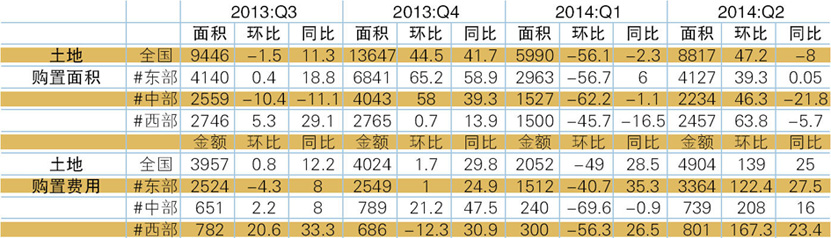 表2 2013年Q3 -2014年Q2土地购置面积及费用情况 单位:万平方米、亿元,%