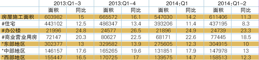 表3 2013年Q3 -2014年Q2房屋建设情况 单位:万平方米,%