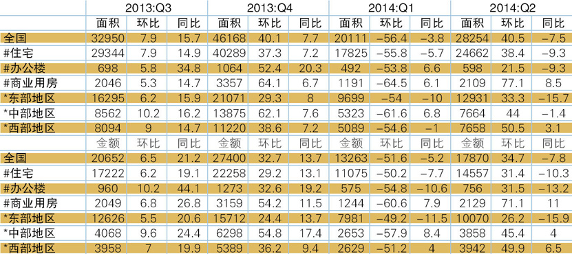 表5 2013年Q3 -2014年Q2商品房销售情况 单位:万平方米,亿元,%